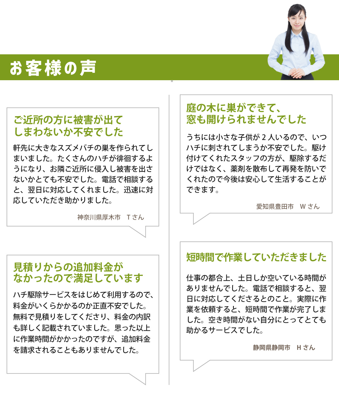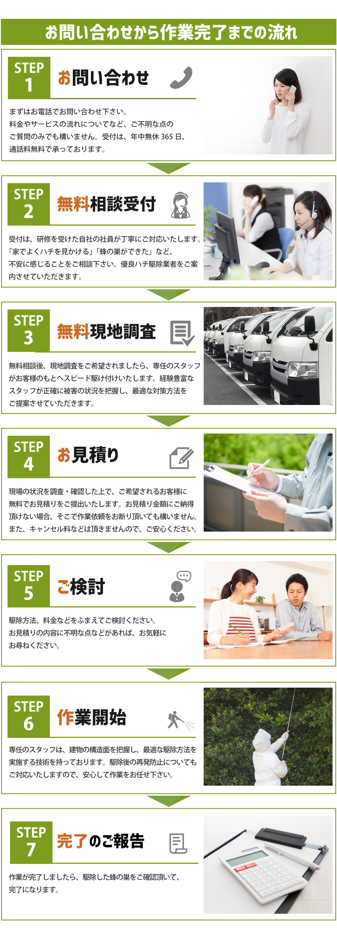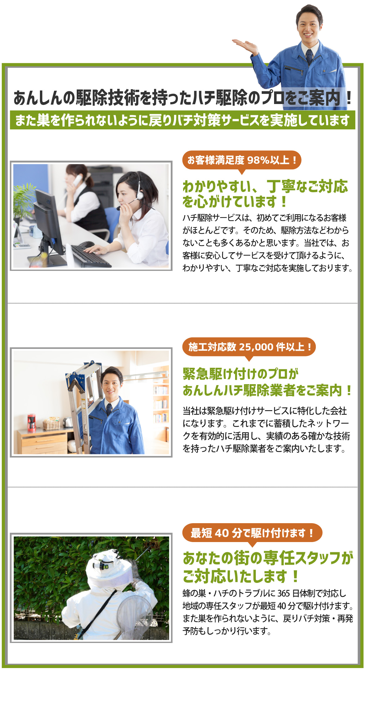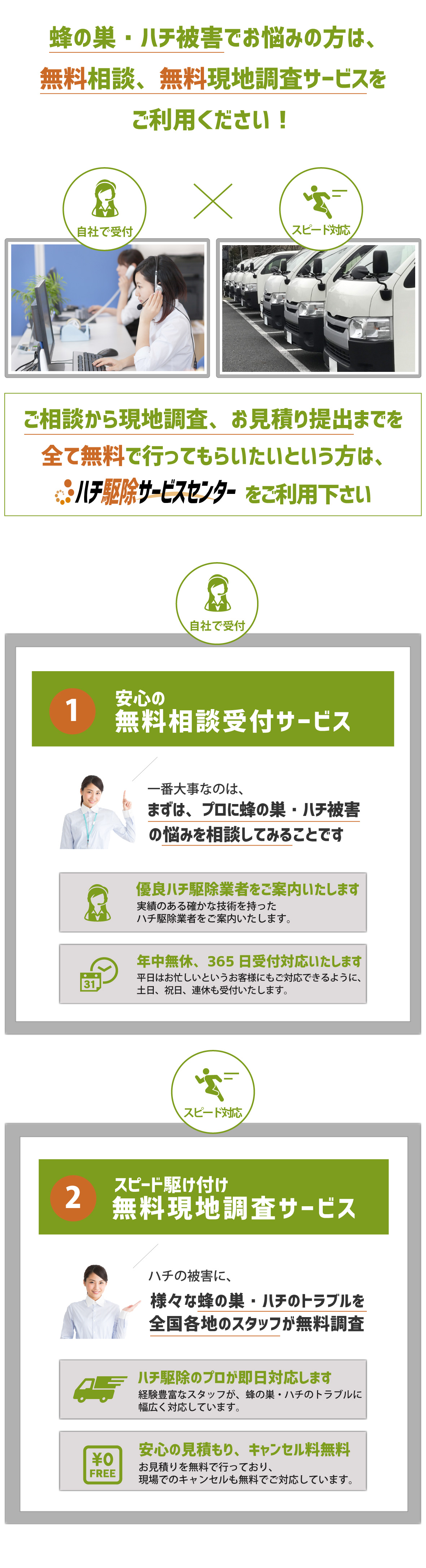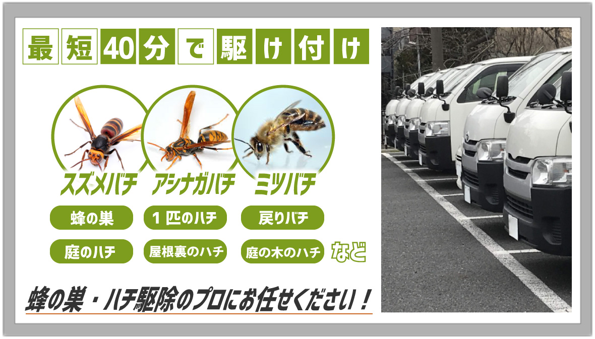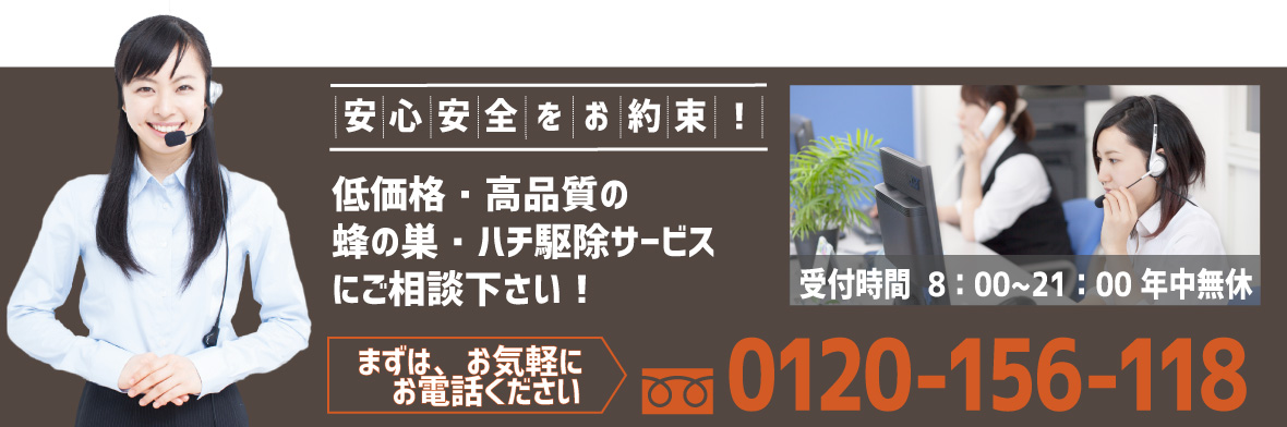 電話をかける(click)ハチ駆除(蜂の巣駆除)を依頼する際、お困りになるのは業者選びではないでしょうか?家の玄関、軒先や軒下、ベランダや窓際、庭など家の周りに蜂の巣があると、いつハチに刺されてしまわないか、近所の人に被害が出てしまわないかと不安ですよね。また、そういった場所以外にも屋根裏(天井裏)や床下といった目に見えない場所や部屋の中に蜂の巣が作られていることもあり、いつの間にかハチが入ってしまったということもあります。そうなる前に少しでも早くハチ駆除会社にハチの駆除・退治や蜂の巣の除去を依頼したいですよね。なるべくなら、口コミや評判が良い人気の業者や評価の高いおすすめ蜂駆除業者に依頼して、安心・安全・低価格でハチ駆除を済ませたいものです。では、どういったハチ駆除業者に依頼すれば良いのでしょうか?まずわかりやすいのは『価格』かと思います。蜂駆除の価格は、ハチの種類(スズメバチ、アシナガバチ、ミツバチなど)や巣の大きさ・場所・高さなどによって異なります。そこで『無料現地調査・無料見積もり』が利用できる業者をおすすめいたします。無料であれば申し込みやすく、駆除料金のイメージや業界の相場を手軽に知ることもできます。また、業者の料金や見積もりの説明がわかりやすいことも重要なポイントです。ハチ駆除料金は被害の状況によって異なるので見積り価格だけを見ても、それが適正料金であるかもなかなかわからないですよね。そこで作業費用や清掃費用など見積もりの内訳・詳細までの説明が丁寧でわかりやすい業者であればご請求金額に追加料金が発生するといったトラブルもありません。同様に重要なのが『対応の早さ』です。お客様によっては今日中(本日中)に駆除をしてほしい、申し込み翌日には駆除を完了させたいといった方もみえるかと思います。そのため依頼後、即日対応、すぐに、早く対応できる蜂の巣駆除会社をおすすめいたします。あわせて、連絡がしやすい問い合わせ窓口を設けている業者だと心強いですね。また、業者の『実績』も重要です。ハチ駆除に必要となる資格はありません。そのため、業者の対応が不十分だと戻りバチなどハチ被害の再発が起こってしまうことがあります。実績豊富な業者であれば、これまでに多くのハチ駆除を行ってきており、そこからさまざまなケースに対応できる十分な技術と知識を持っているので、信頼出来る優良業者といえます。以上のようなポイントに気をつけながら業者選びをしていきたいものですが、いきなり依頼するというのはご不安のことかと思います。弊社では、ハチ被害やハチ駆除のサービスについてのご相談・お問い合わせを無料で承っております。窓口は年中無休365日・通話料無料でご利用頂けますので、いつでもお気軽にご連絡ください。また、現地調査からお見積もりまですべて無料となっております。ミツバチは10,000円から、アシナガバチは11,000円から、スズメバチは13,000円からとわかりやすい料金体系をご用意しております。受付後は地域の専任スタッフが最短40分で直ちに駆けつけ現地調査を行い、お見積もりをご提出まで致します。駆除作業は弊社のこれまで経験やノウハウを活かした駆除技術で、ハチ駆除の専門家であるスタッフが専用の薬剤を使用し徹底的な駆除、蜂の巣の撤去(処分)、戻り蜂などの再発防止の対策まで行います。ハチ被害・蜂の巣駆除でお悩みの際は、ちょっとした質問、相談からでも、弊社にお気軽にご連絡ください。